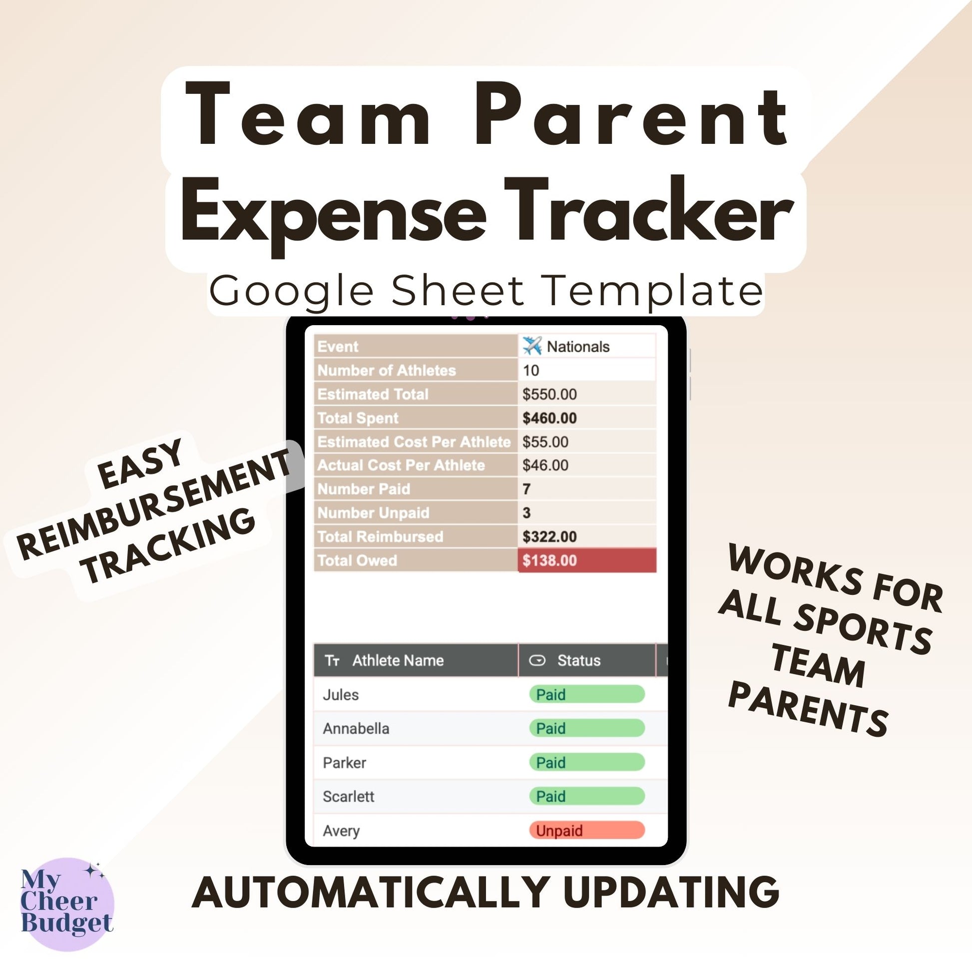 This all-in-one Google Sheets template is designed specifically for team parents and cheer moms who handle the logistics and the money—without losing track of receipts, reimbursements, or your sanity.